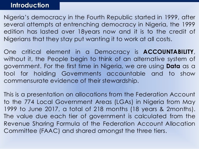 Other studies such as aigbokhan 1999 jimoh 2003 emengini and anere 2010 akeem 2011 and usman 2011 carried out empirical studies on the effects of the level of decentralization of government activities including reve nue allocation on nigeria s economic development using. The report showed that before. Formula for distribution between local government councils. Revenue sharing formula in nigeria the revenue mobilization allocation and fiscal commission rmafc is charged with the duty of revenue sharing between the three tiers of government.
